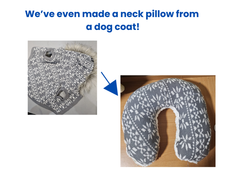 Cushions – We can either stitch together items of clothing or can use adult clothing eg a shirt or jumper to make cushions. The outer will be made from your provided item/s and will have a zip. We can provide the cushion with or without a cushion pad. We can also use offcuts from your clothing to add to the stuffing. Each cushion size will vary slightly due to the type of clothing provided but will be approximately 40cm X 40cm to 45cm X 45cm.
